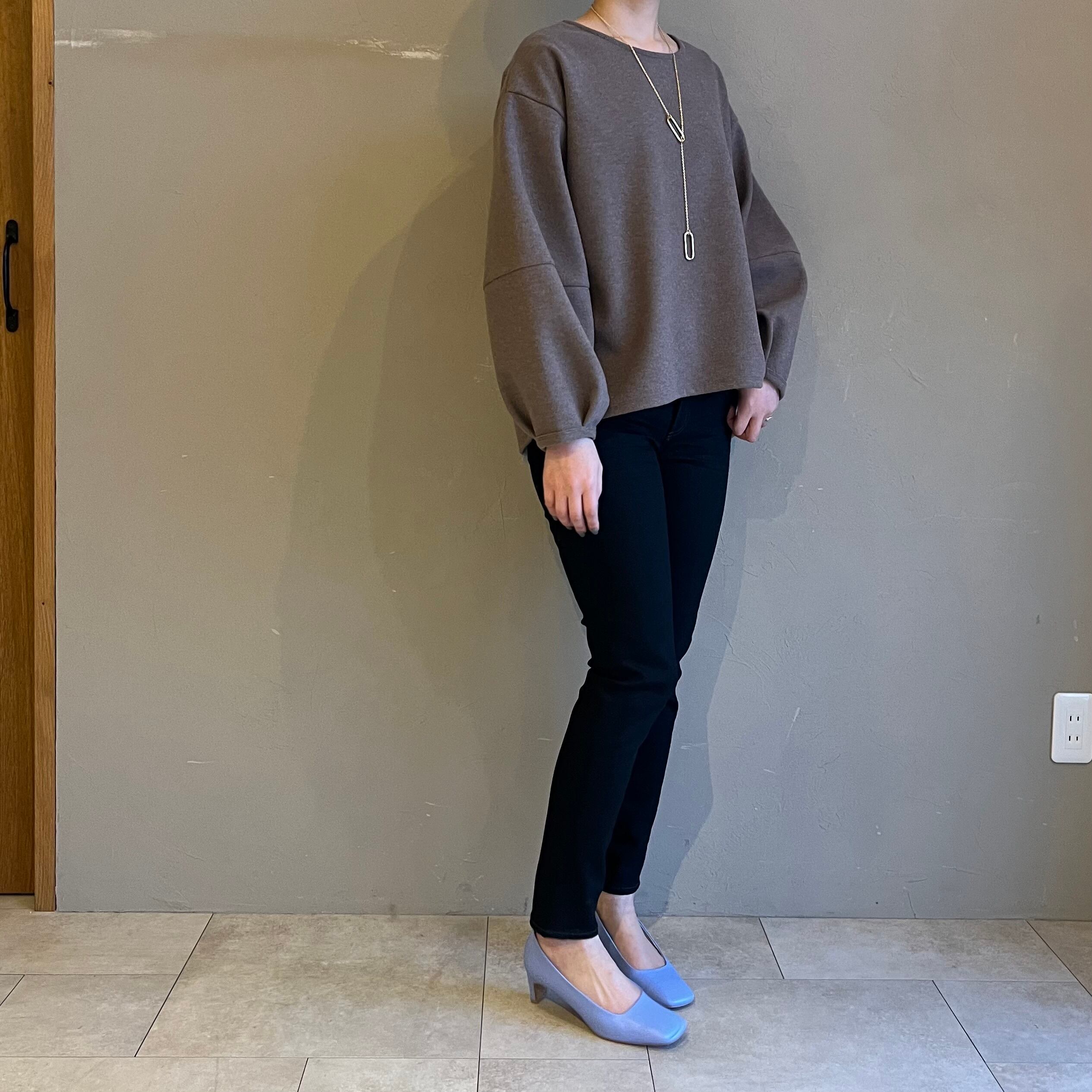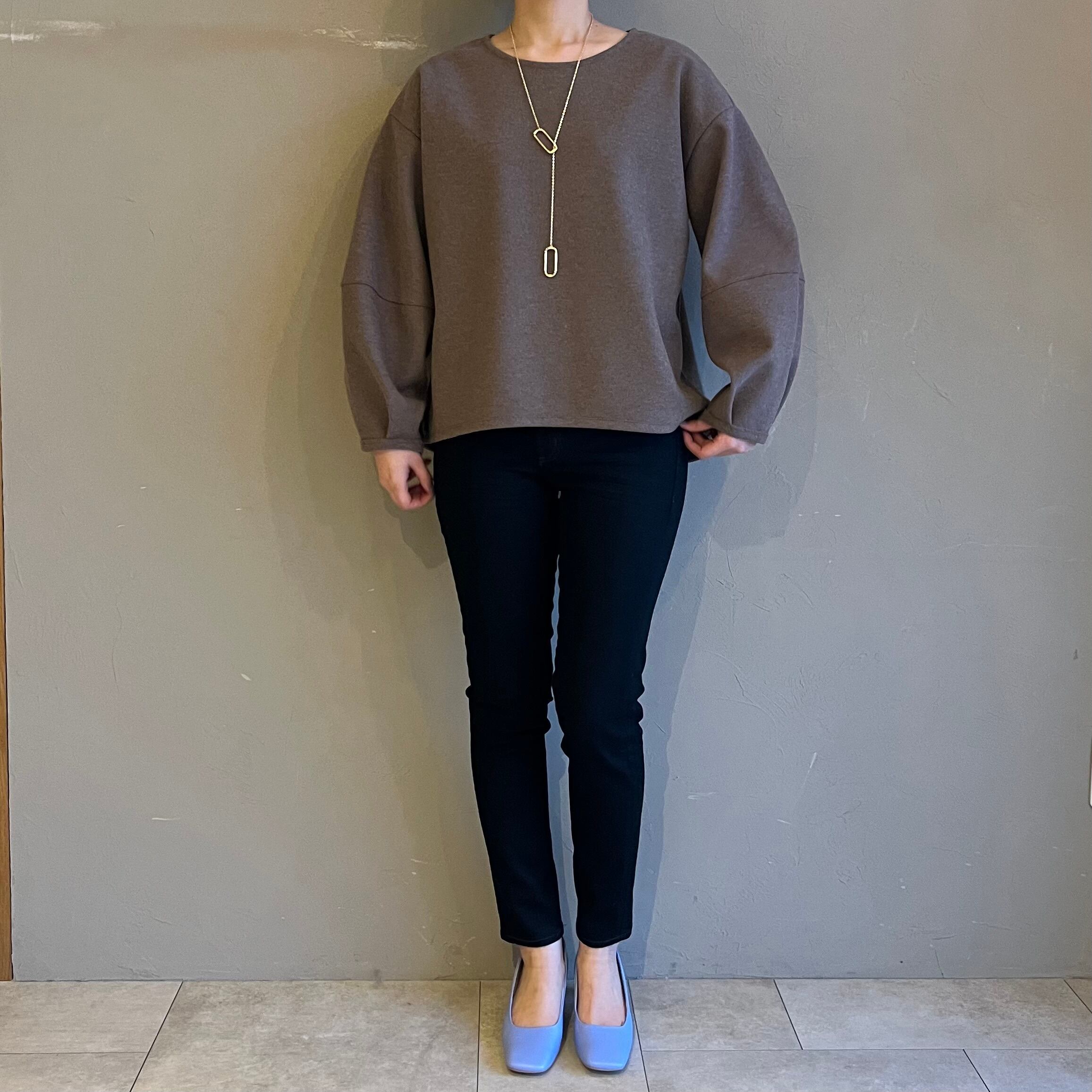 ぽわんとしたデザインと、ややボートネックのすっきりとしたシルエットが女性らしい1枚。