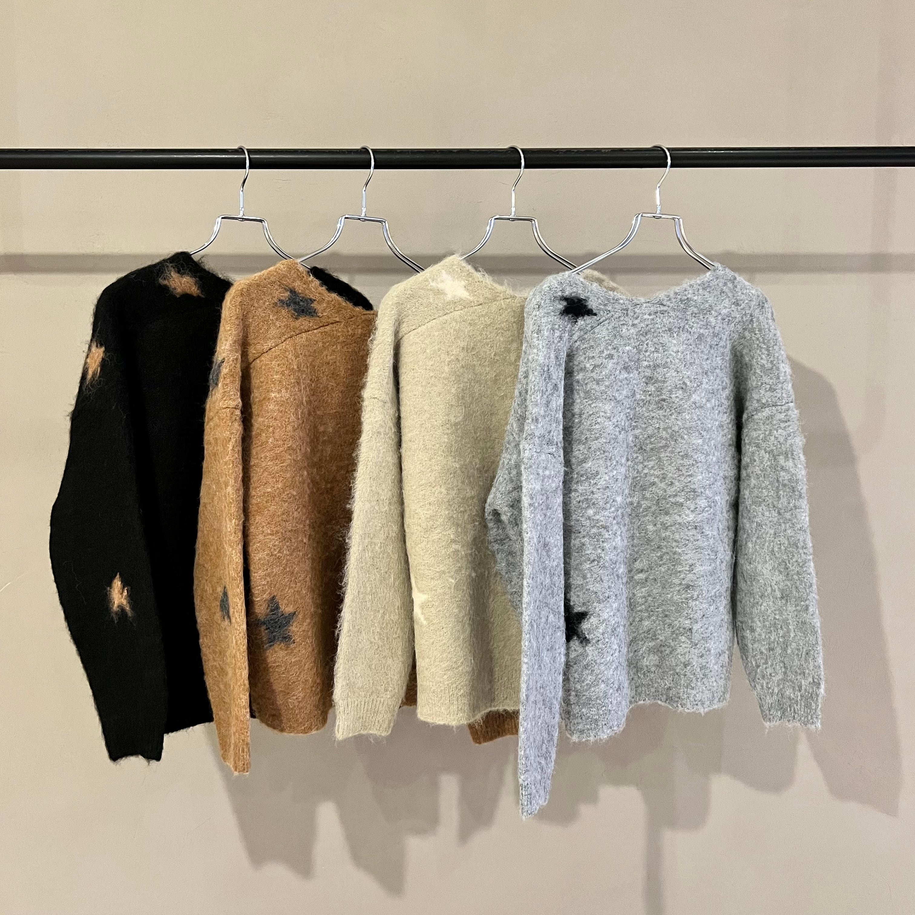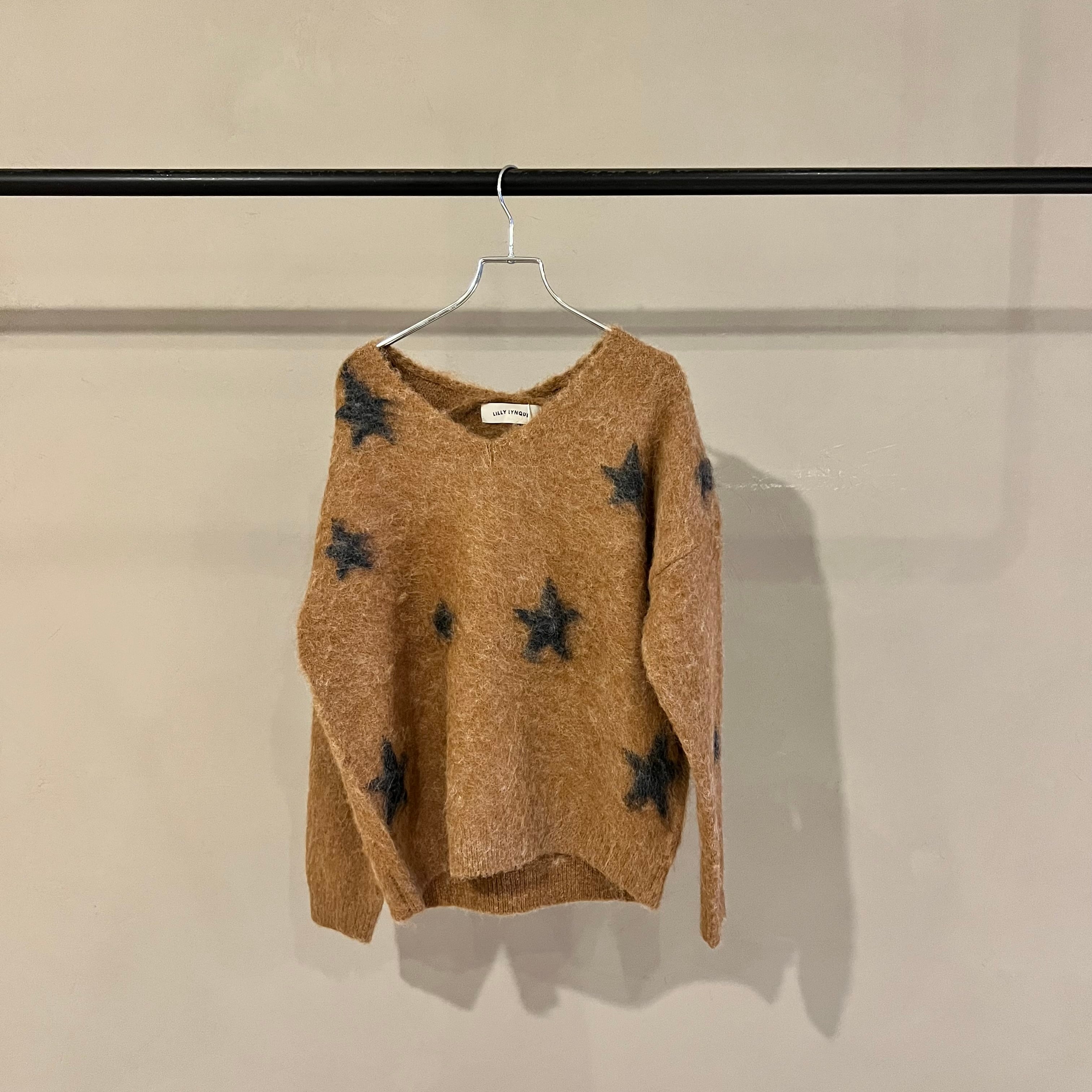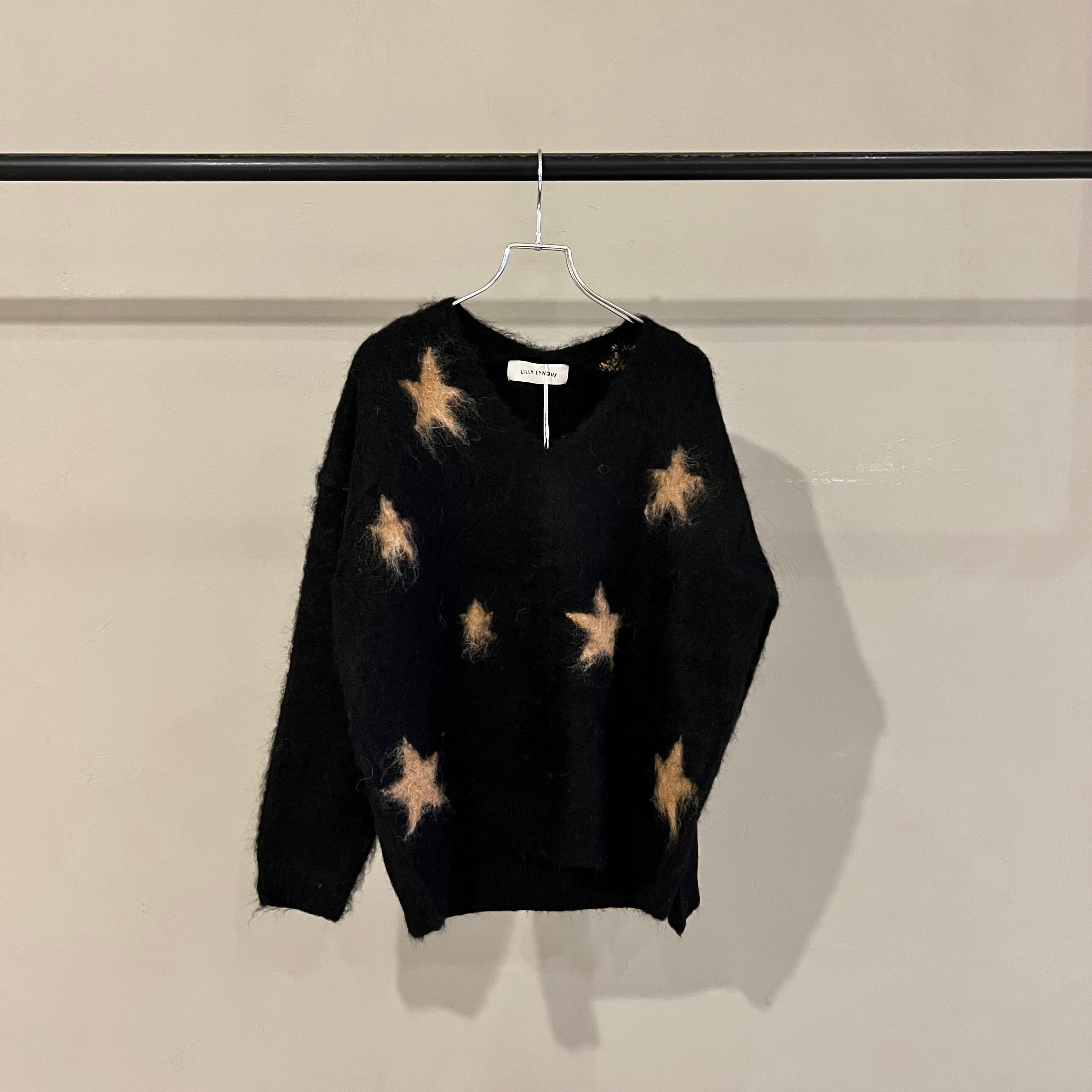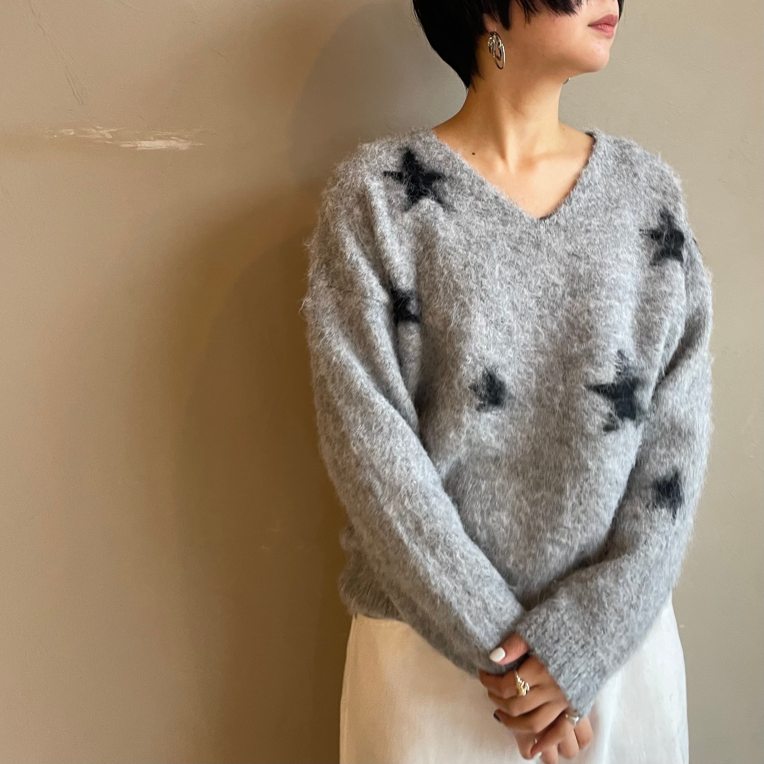 シャギーニットにサイズの異なる星がちりばめられたVネックニット。