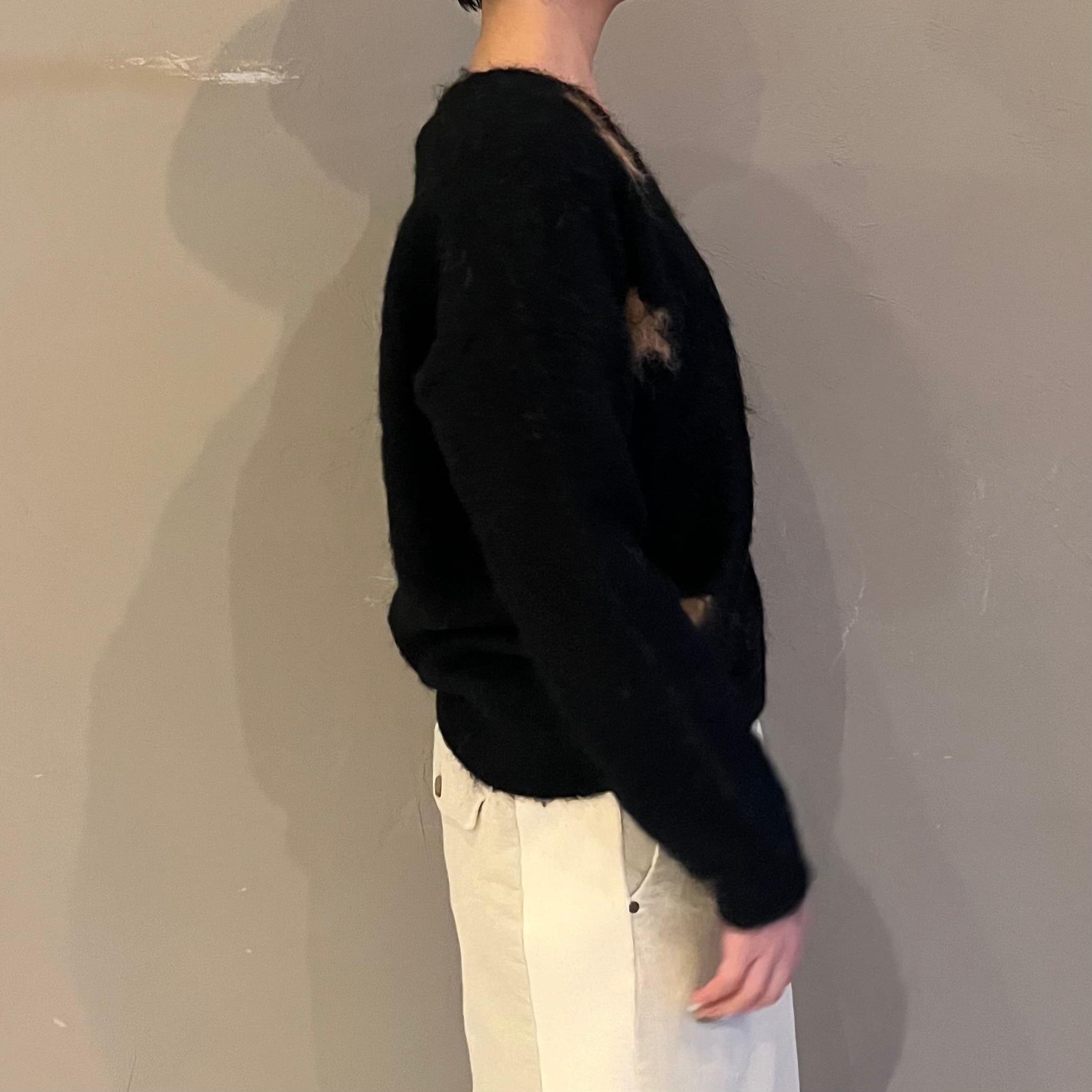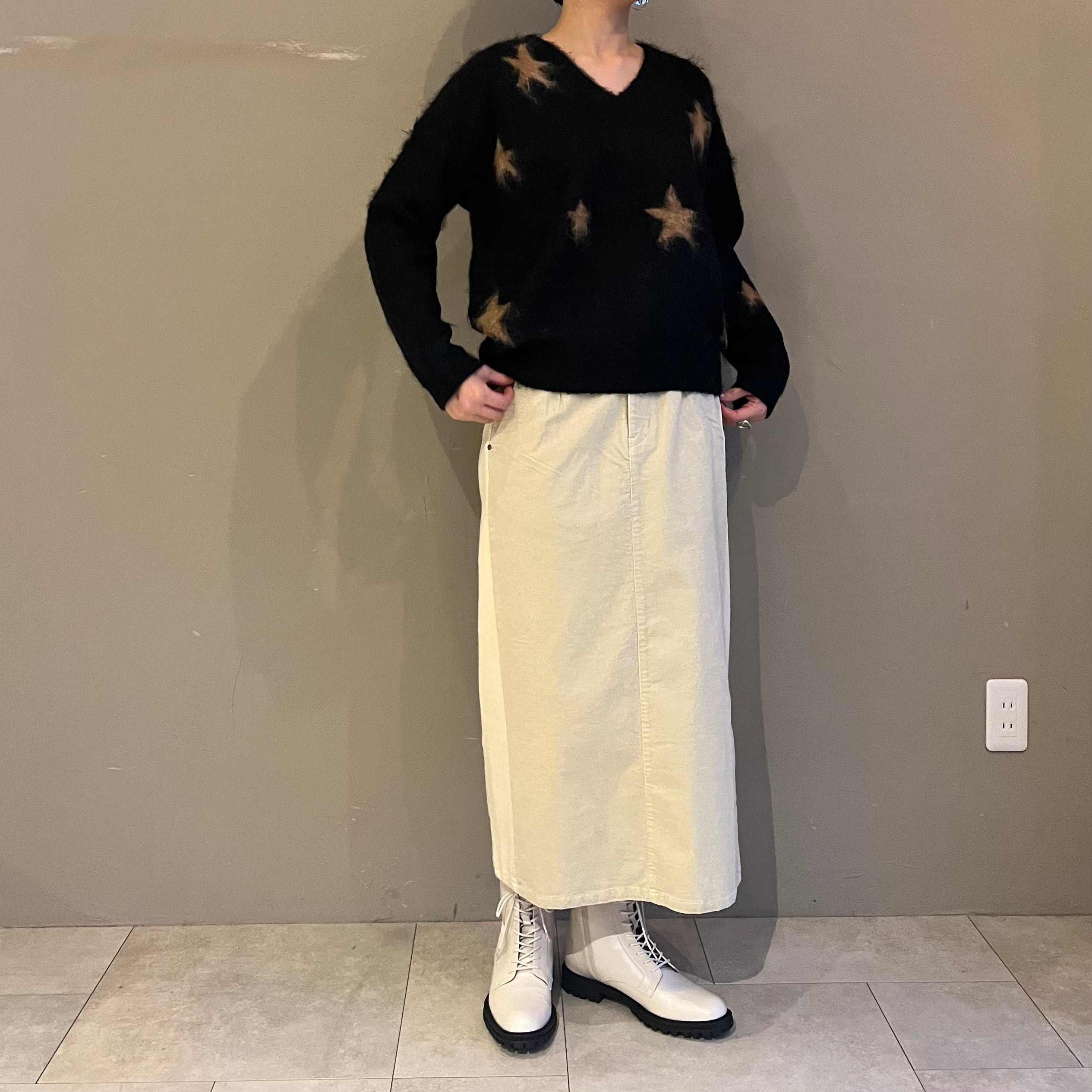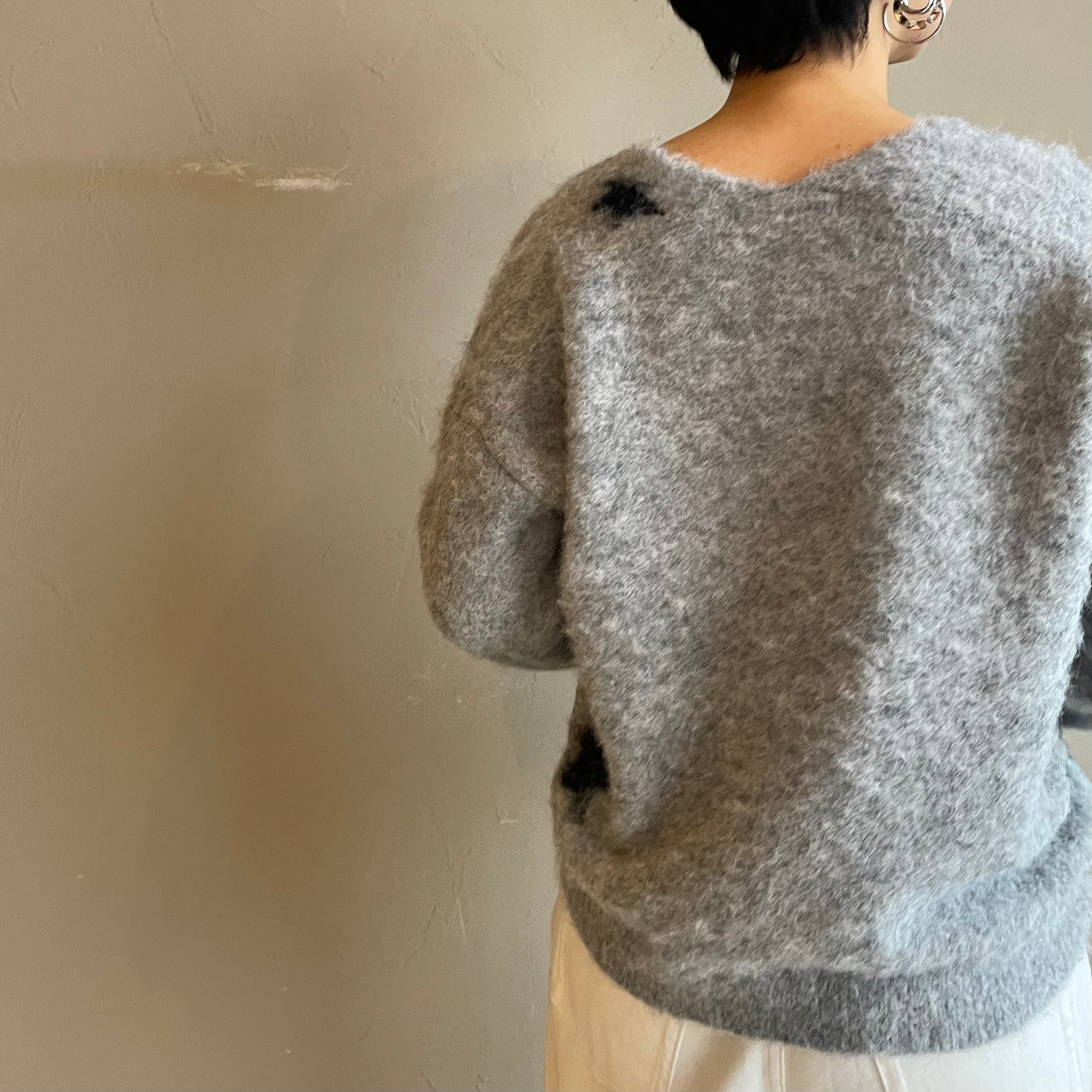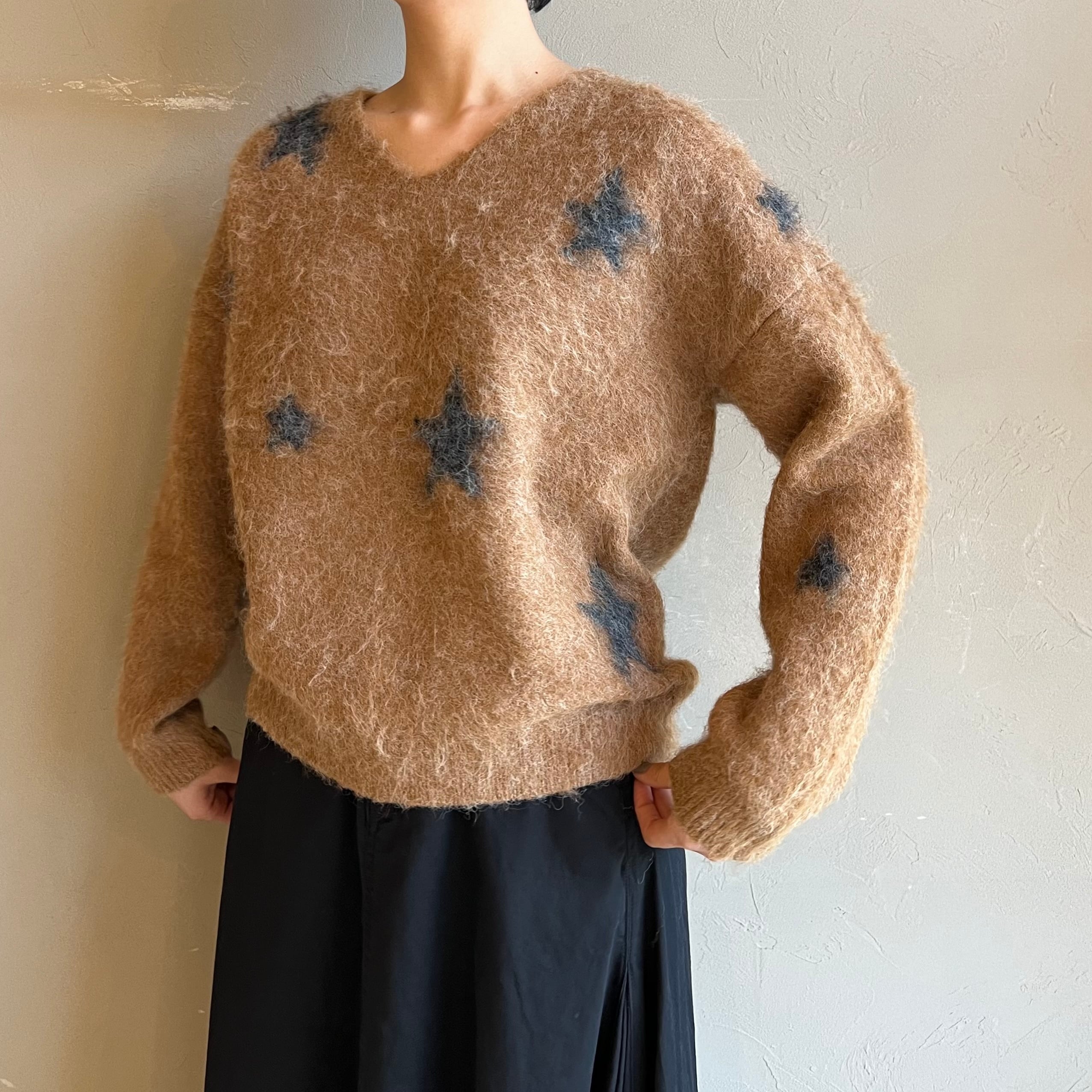 シャギーニットにサイズの異なる星がちりばめられたVネックニット。