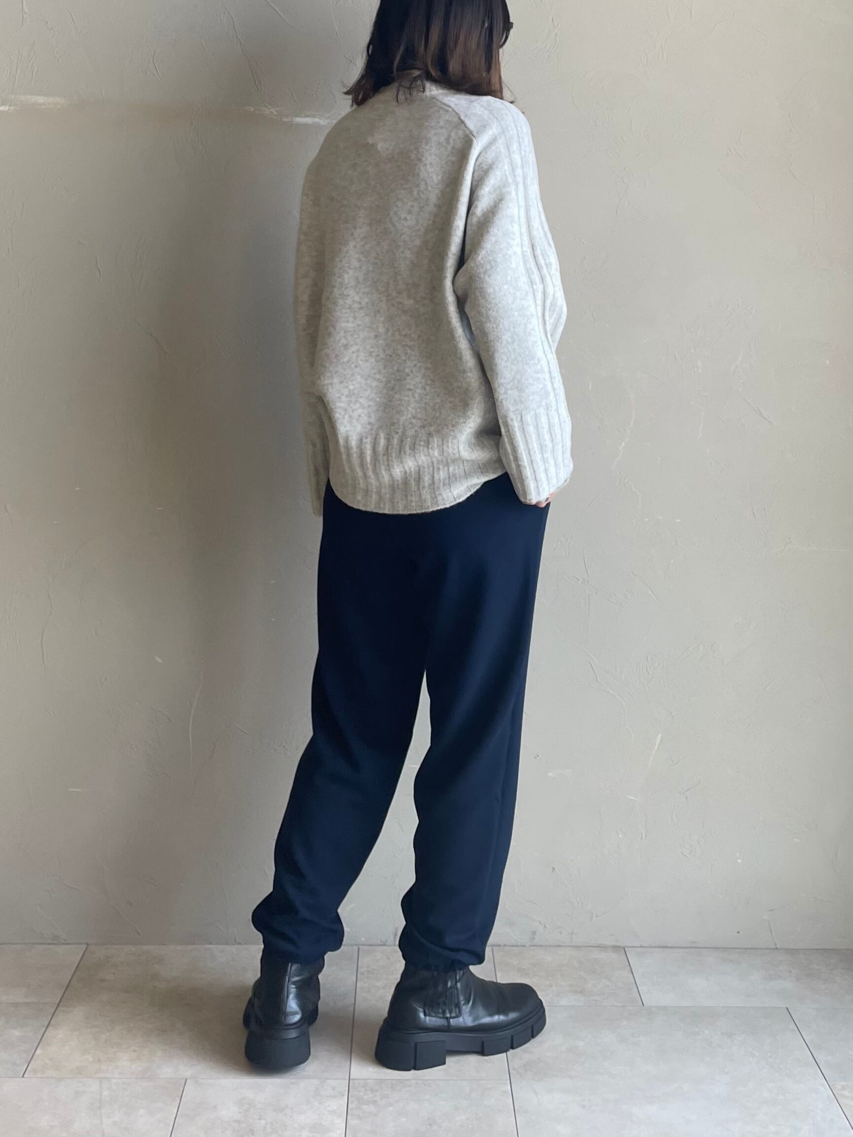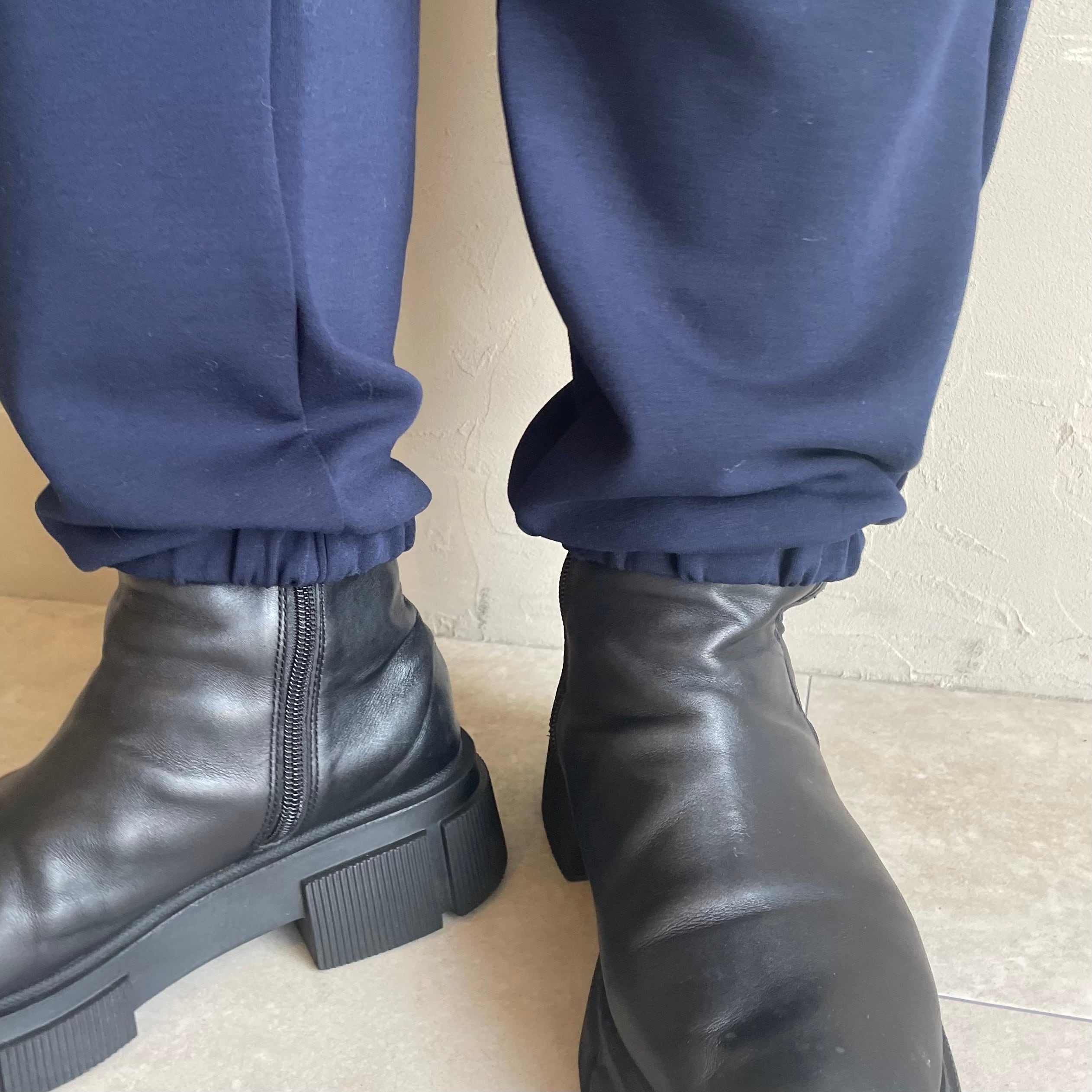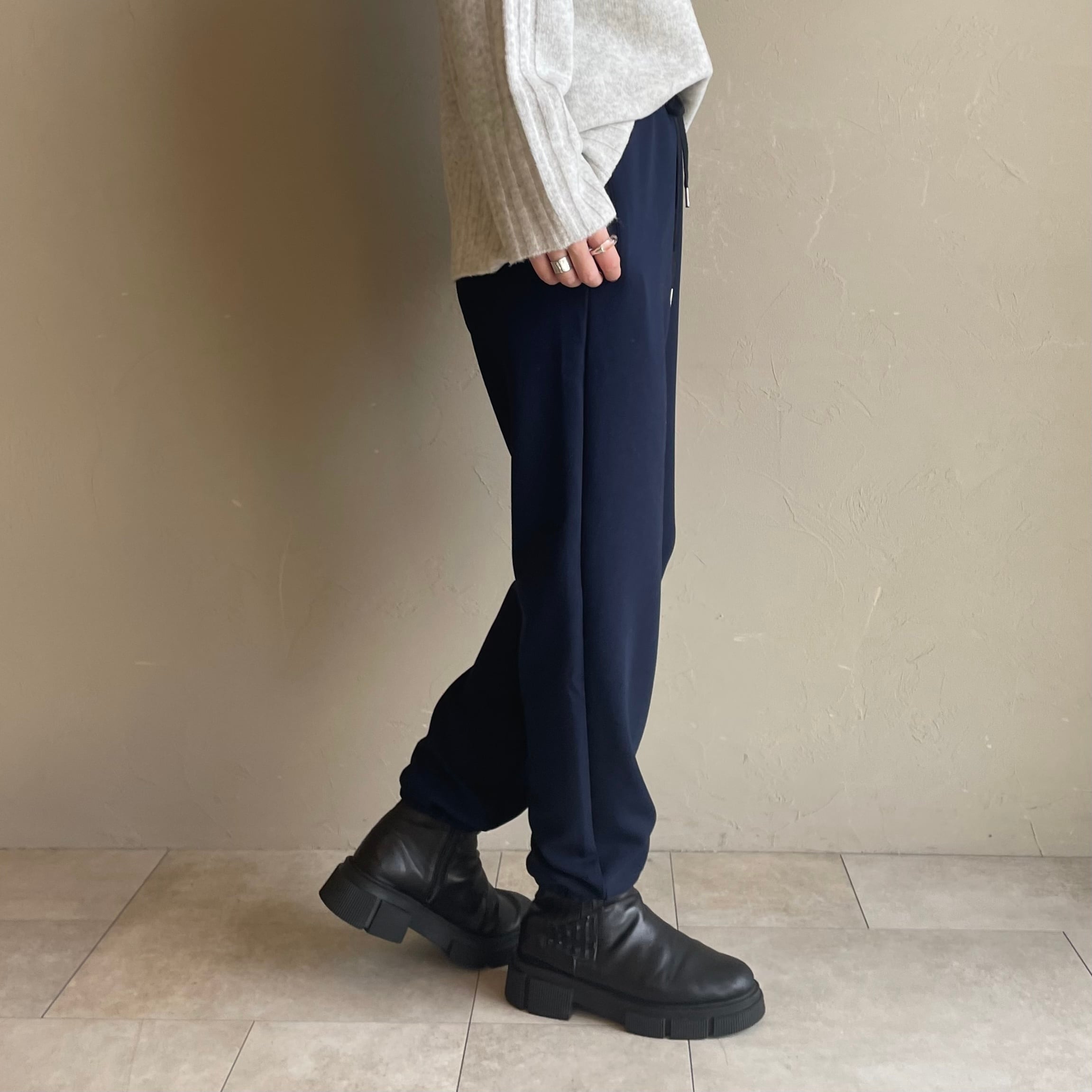 つるっとしたストレッチの効いたライトダンボール素材のジョガーパンツ。