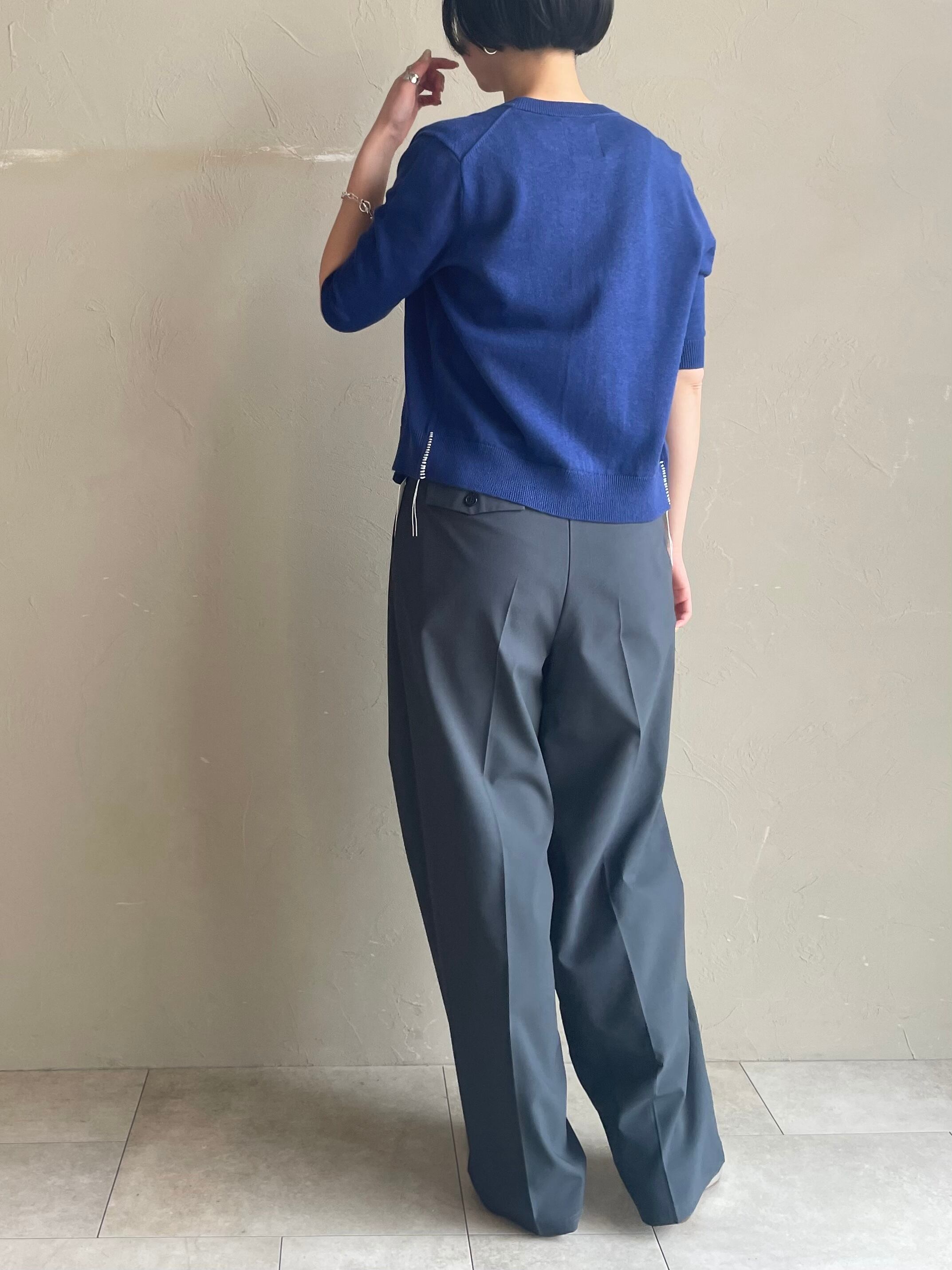 一見シンプルですが、胸元より少し上に付いた小さいポケットのデザインや、裾サイドのさりげない紐など、遊び心もあり他と差がつくアイテムです。