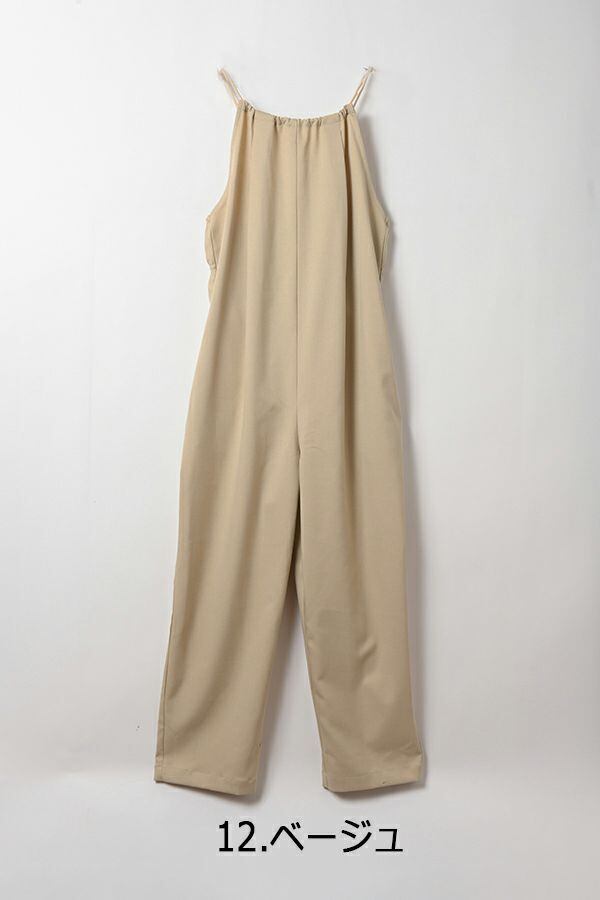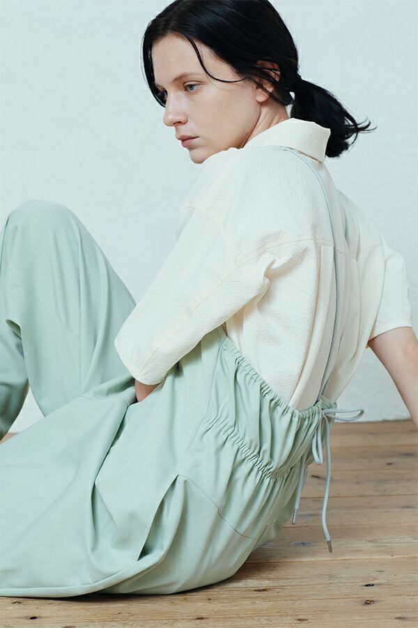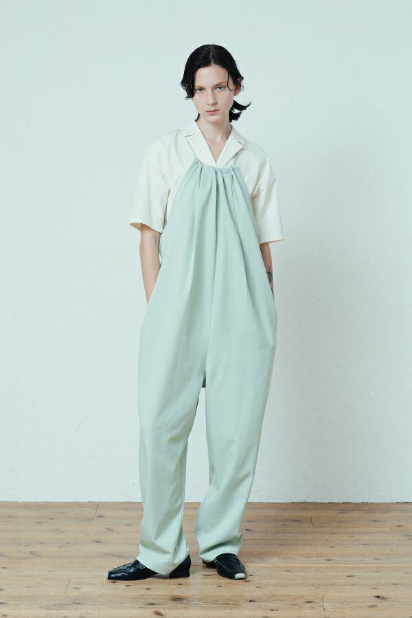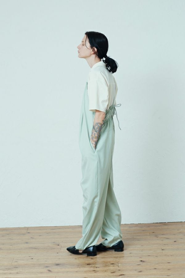 サマースーツの様な雰囲気のストレッチツイルを使ったギャザーサロペット。