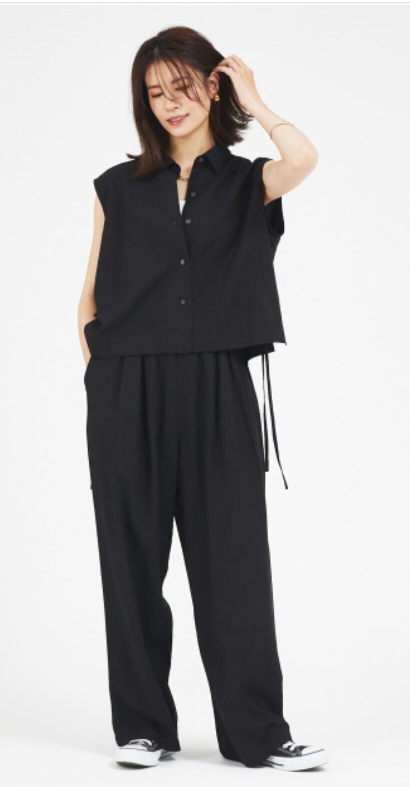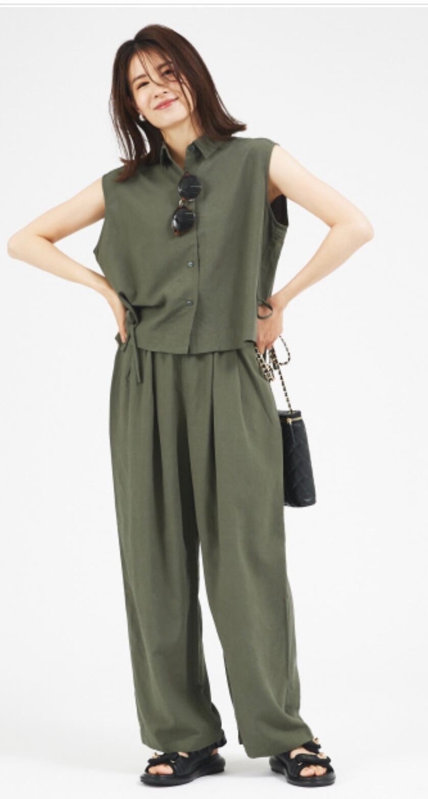 リラックス感が出過ぎないように女性らしい旬なシアートップスなど合わせるのもおすすめ。同素材のシャツとセットアップも楽しめるシリーズ展開です。