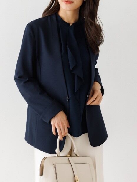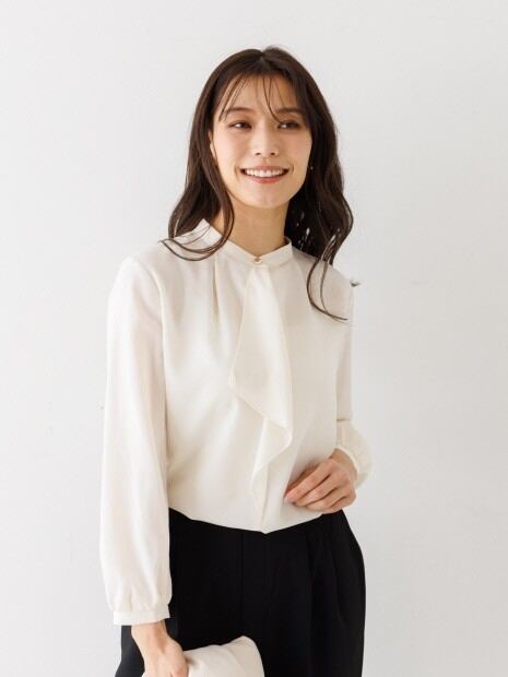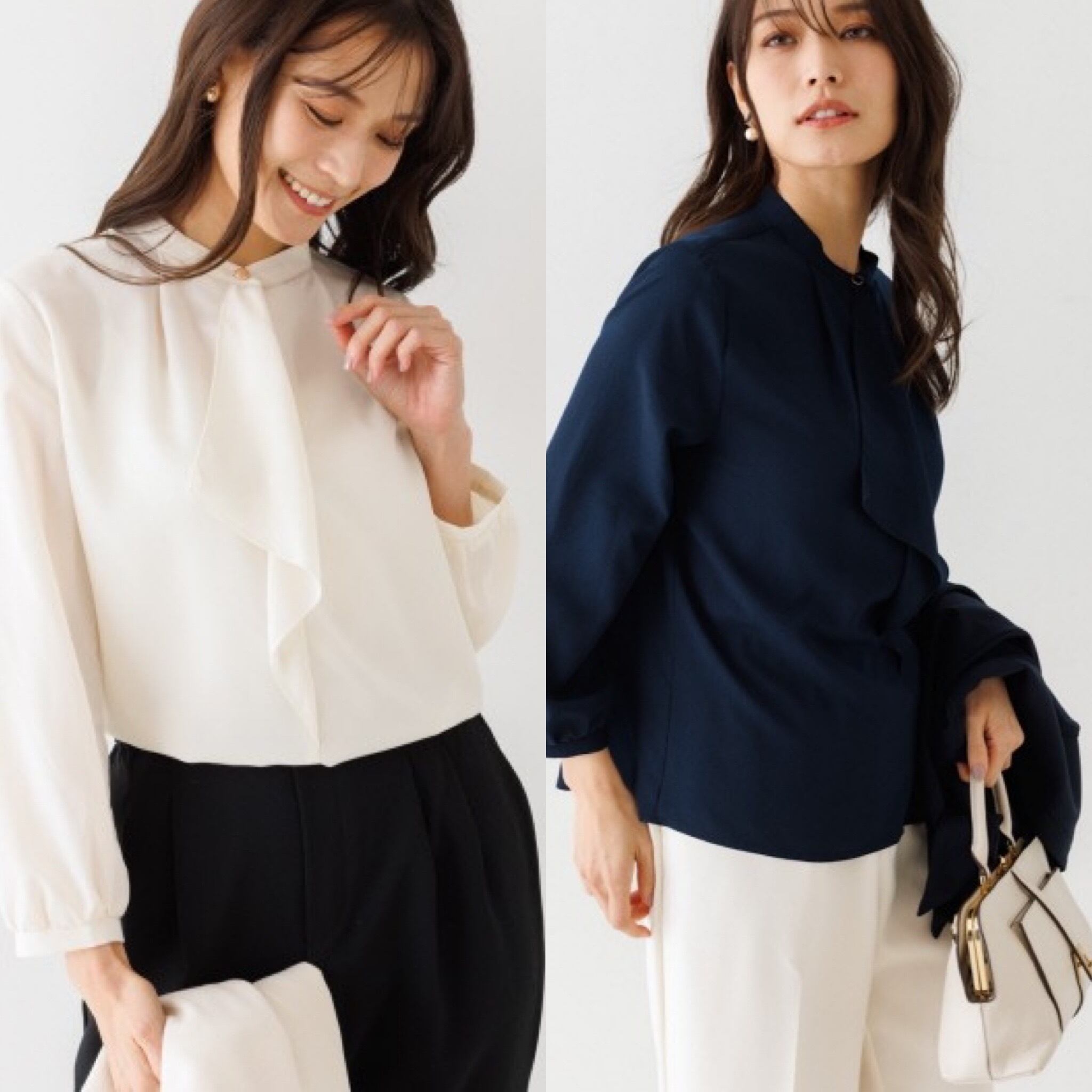 胸元のフリルと金ボタンがポイントのジョーゼットブラウス。1枚でもさまになる程よいサイズ感。すっきりめの袖丈でジャケットのインナーにも最適。色違いで欲しくなる王道ブラウスです。