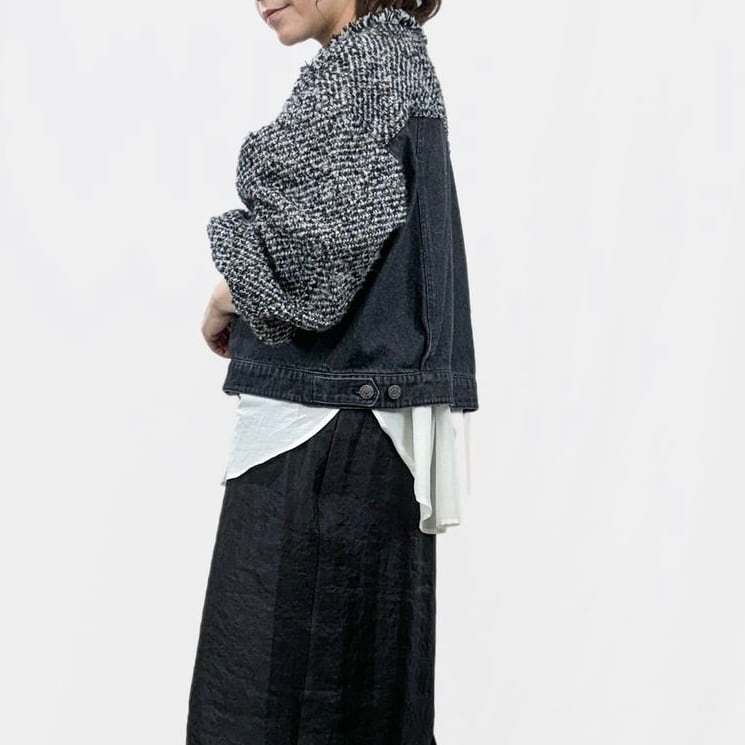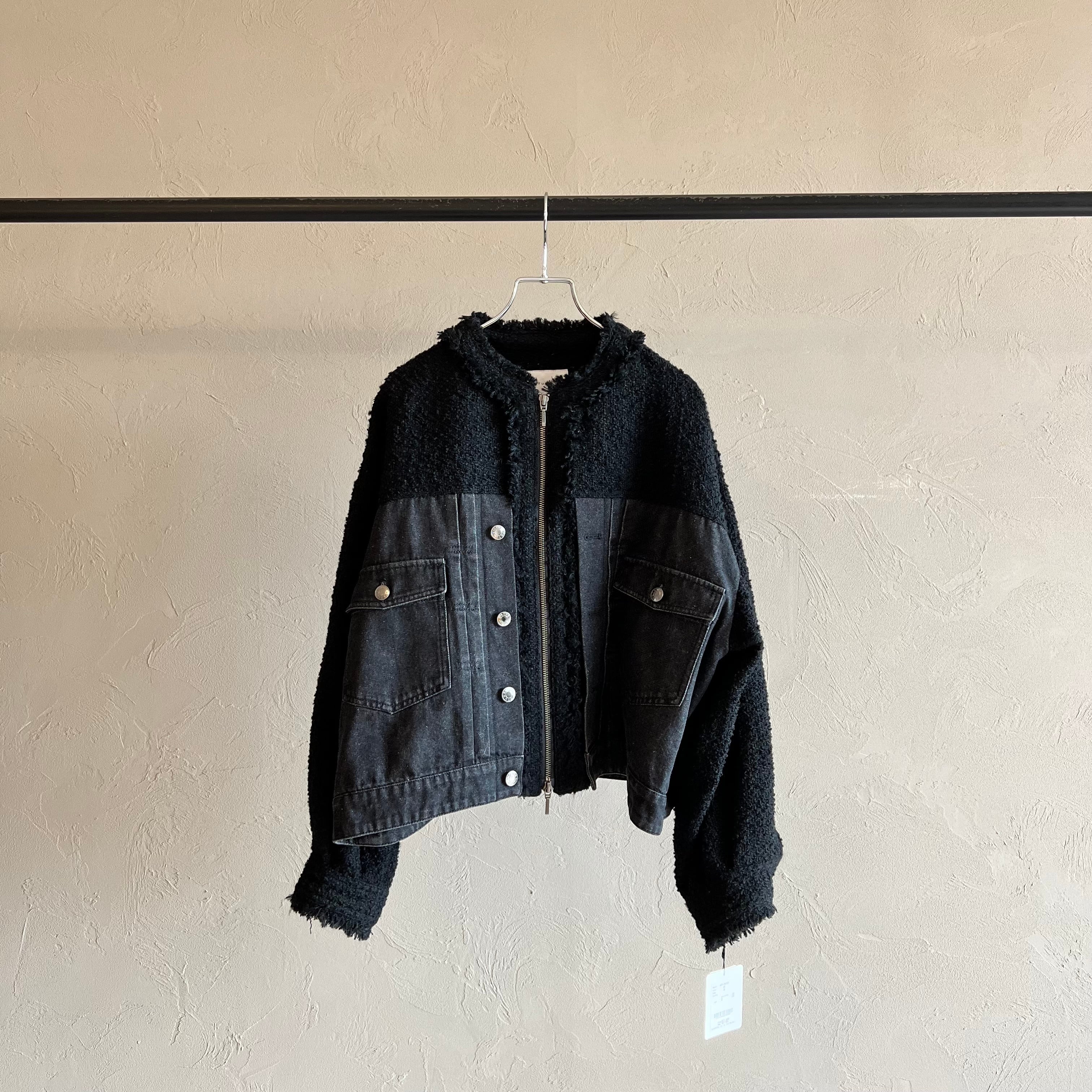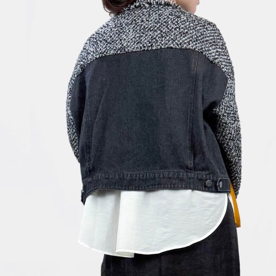 ウールミックスのソフトでふっくらとした表面感のあるツイードと相性のいいオンスのデニムのコンビネーションジャケット
