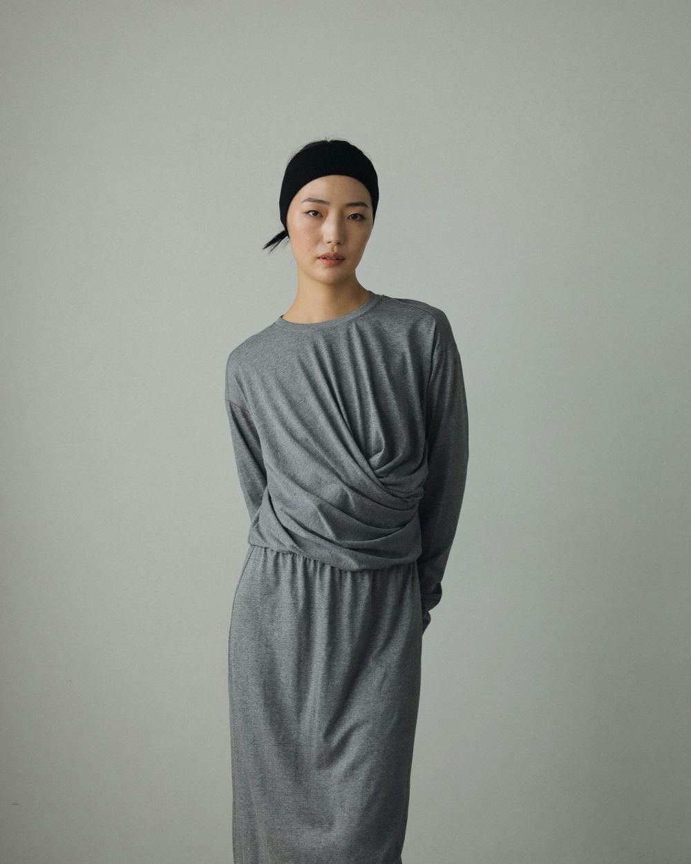 フロントにもバックにもドレープでねじりを施したワンピース 。ウエストは細いゴムが入ってるのでブラウジングして着用してください。デザイン性のあるカットソー素材のワンピース はデイリーに着ていただけて、1枚でお洒落に見せてくれるのでおすすめです。